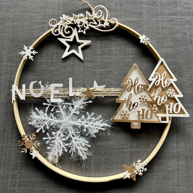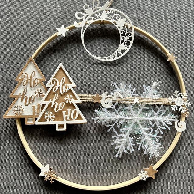 Cercle en bois décoré de divers motifs en papier, plus un flocon enneigé.