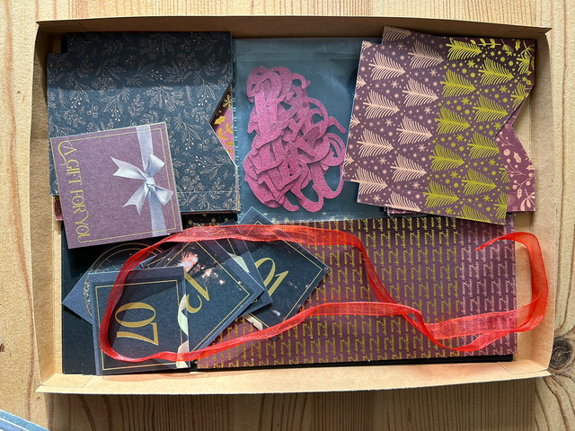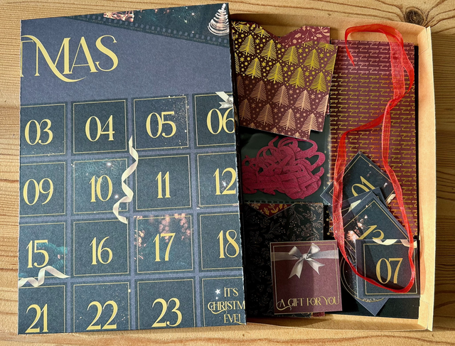 Calendrier de l’Avent en kit, à construire soi même, fourni avec toutes les pièces nécessaires : étui, chiffres, ruban …