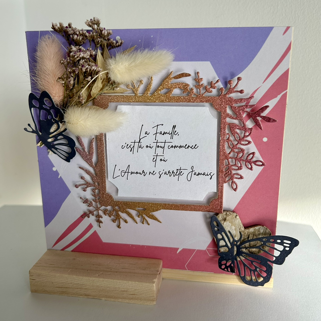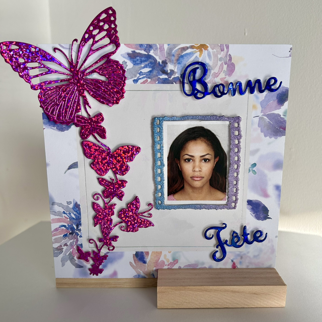 Porte photo en plaque de bois sur socle à poser, agrémenté de différentes décorations en papier et cadre pour petite photo